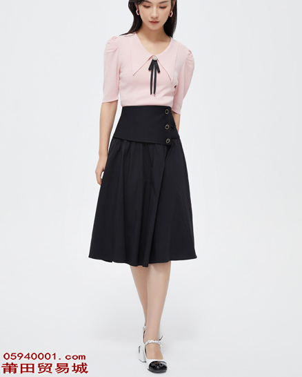 粉色的棉质上衣剪裁略微贴身,柔软的面料呈现出异样的淑女气质,调配纯黑的伞裙,更是高雅又复古。整体服饰充溢少女感但又不乏时髦,让人一见钟情。