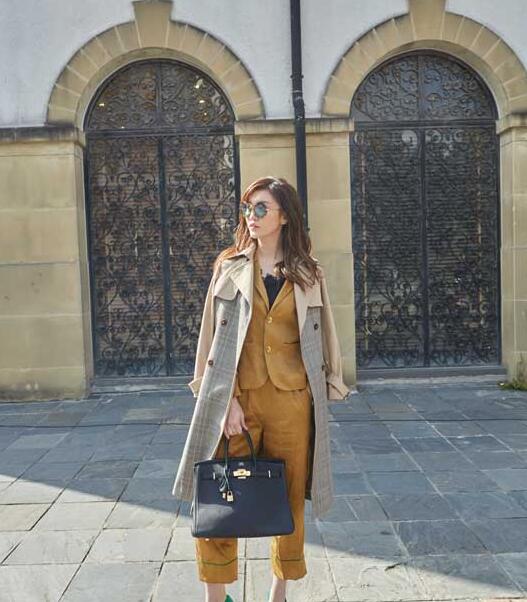 黄色的秋装充满了秋季成熟的步调,但是鲜艳的颜色,让我时尚年轻,用在商务衣服里,九分的裤子,感觉还不错吧~黄色的衣服和绿色的高跟鞋相互配合起来,清清爽爽。米色的格纹风衣长及膝盖,双排扣的设计,让我的衣服有着英伦的气质耶~