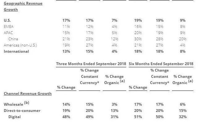 期内,集团旗下仅Vans与The North Face两个品牌录得增长,分别录得26%和5%的增幅,timberland、Wrangler和Lee三个品牌的收入则受西尔斯百货破产冲击,分别下跌2%、5%和9%。