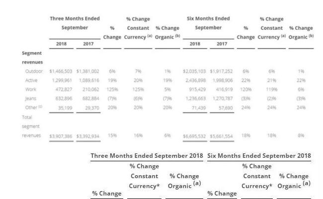 按部门分,包括Vans、Timberland、Wrangler和The North Face等品牌的户外运动部门第二财季销售额同比增长7%至14.66亿美元; 包括Lees在内的牛仔部门销售额下跌6%至6.32亿美元; 包括Red Kap、Bulwark和Majestic等品牌的制服部门销售额同比增长125%至4.72亿美元; 其他部门销售额则同比大涨20%至3520万美元。