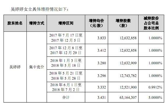 莆田运动鞋得悉,此前,吴婷婷分别在2017年7月17 日至2017年12月5日、2017 年12月8日至2017 年12月29日、2018 年1月3 日至2018年5月18日、2018 年5月21日至2018年5月28日分四次增持报喜鸟股份,每次增持份额均为公司总股本的1%,增持均价介于3.3元/股-3.8元/股之间。