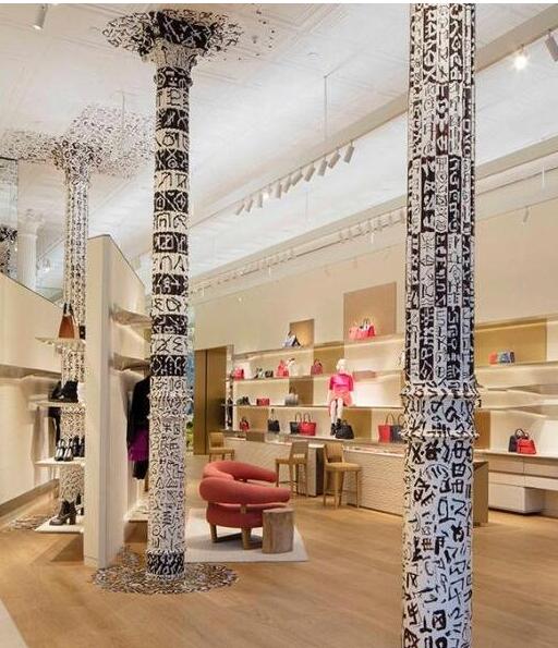 不过与低沉的外观不一样,Peter Marino 在店肆内发明了极为浓郁的艺术个性。最醒目的是三根绘满了各种黑色图画的柱子。上面的图画是由日本艺术家向井修二发明的。