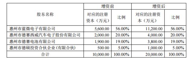 其中公司控股子公司惠州蓝微、惠州电池分别增资人民币5600万元和1900万元,惠州市德赛西威轿车电子股份有限公司(以下简称“德赛西威”)增资人民币2000万元,惠州市德硕投资合伙企业(有限合伙)增资人民币500万元。增资完成后,惠州新源的注册资本由人民币1亿元增加到人民币2亿元,各股东的持股份额坚持不变。