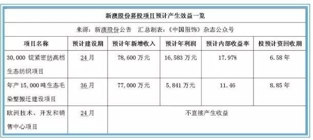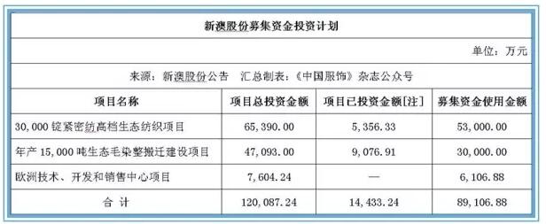 据记者了解到,新澳股份这次非公开发行股市征集资金金额估计不超越8.91亿元(含发行费用),扣减发行费用后将用于施行“30,000锭严密纺高级生态纺织项目”、“年产15,000吨生态毛染整搬家建设项目”和“欧洲技能、开发和出售基地项目”。