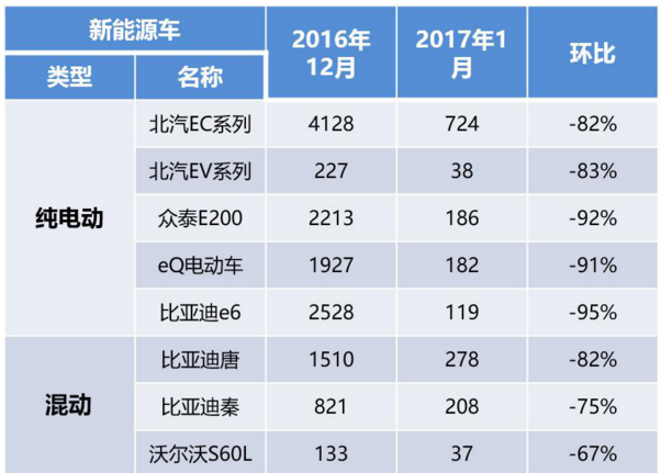 日前,乘联会发布1月各车企销量数据,作为2017年的第一份成果单,天然备受大家重视。1月,国内乘用车销量为207.5万辆,环比更大跌23.5%,乘用车商场2017可谓“开年晦气”;更令人感到大跌眼镜的是,1月份全国新能源乘用车销量仅5559辆,环比降低87%,同比降低60%,呈现“断崖式”跌落。