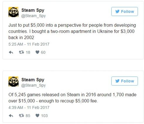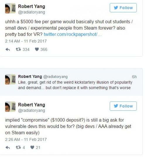 在Steam发布这一则音讯后,曾开发《眼镜蛇沙龙》以及裸男搓澡游戏《RinseandRepeat》的游戏开发者RobertYang表达了自个的定见,他以为3A级的厂商对这点小钱也许不在意,可是这一行动将进一步杀死那些小开发者。而SteamSpy也表明5000美元将会狠狠蹂躏许多其他国家的开发者。