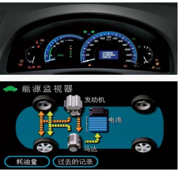 第六代混合动力凯美瑞的外表和中控台上液晶屏中的能量变换显现