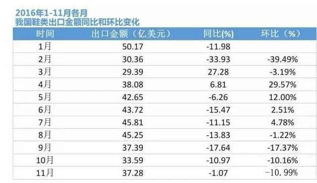 2016年1~11月中国鞋类出口量值汇总。从出口总量值来看,2016年全年中国各类鞋靴出口均呈现下滑态势。