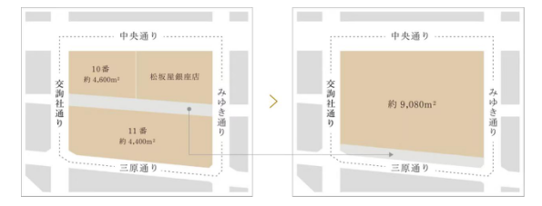 “GSIX”建在大型百货商店“松坂屋”等设备的原址上,跨过两个街区,占地面积约9080平方米,建筑面积约为148700平方米,单层写字楼面积东京最大,屋顶花园面积为银座最大。