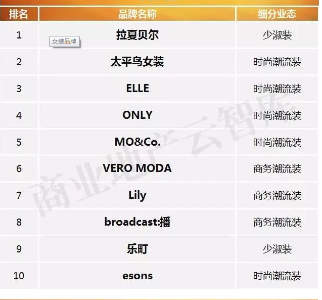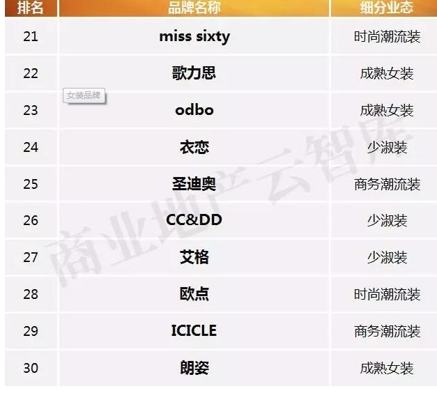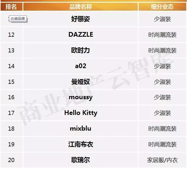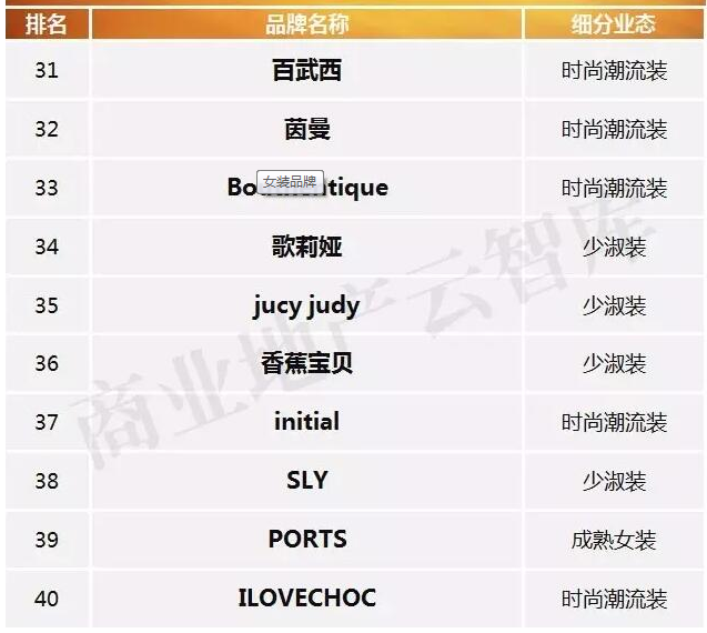 从全体看,时髦潮流女装品牌与少淑装占据了半壁河山,别离上榜19与16席,跟着年青女人花费者占比越来越高,女装品牌也逐步走向“年青化”的趋势。