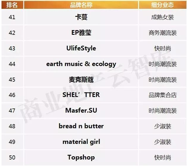 别的,女装品牌仍是以成熟品牌为主导,而新式品牌仅7席上榜,占比14%,且会集在2014-2015年创立或进入中国商场。