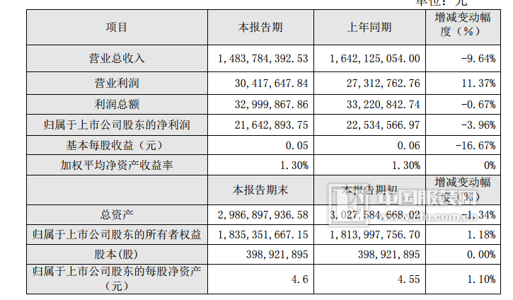 据星期六财报显现,公司2016年1-12月完成经营收入14.84亿元,比上年同期降低9.64%,完成利润总额3299.99万元,比上年同期降低0.67%;归属于上市公司股东的净利润2164.29万元,比上年同期降低3.96%;根本每股收益为0.05元。