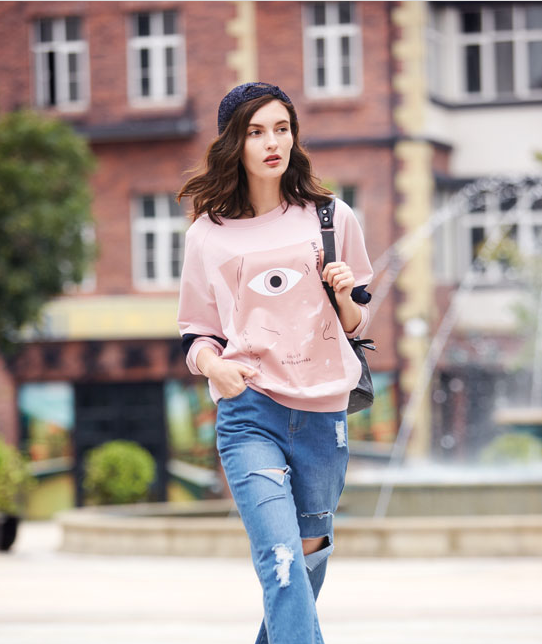 本想美美的秀一秀小身材,结果惹来撕破的牛仔裤。前史的经历通知咱们,牛仔面料是耐脏耐破的好挑选,这时你就需要一件粉色长袖卫衣来调配褴褛元素的牛仔裤,不只能衬托出芳华减龄的感受,还不显得负担。加上怪眼图画的规划投身于粉嫩的卫衣上,全部画风都随之变得小清新起来了。