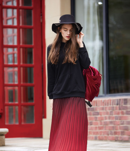 本年不只是个性多样化的一年,更是穿法更丰厚的一年,因而,黑色卫衣几乎每个年轻人都会有一件。黑色是永久的经典色彩,调配起衣服也几乎是百搭的。假如再下搭酒赤色百褶长裙不只能够让身材衬托的愈加完美,还增加不少绚丽古典风貌。