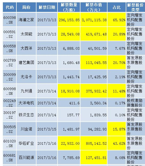 莆田运动鞋批发市场资讯数据核算显示,3月13日至3月17日估计有16家公司限售股陆续解禁,算计解禁46.30亿股。按3月10日收盘价核算,本周解禁市值算计584.32亿元。本周解禁数量超越1亿股的上市公司仅有5家,分别为海澜之家、新洋丰(000902.SZ)、太阳能(000591.SZ)、华钰矿业(601020.SH)和神州通(600998.SH),其中海澜之家多达近30亿股。