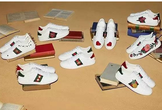 Gucci推出Ace刺绣图腾系列,配上蜜蜂、心形等刺绣图案,大受追捧,鞋子内还全羊皮,保证舒适,是目前较火的一款,简直明星必备。