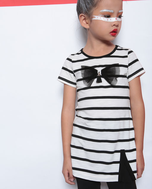 想要一件能够百搭的单品,那就肯定不能错失今天要说的“条纹”。共同的是非条纹不只更漂亮还本领洗,更适合喜爱打闹的小孩子。这款条纹T恤运用纯棉布料,加上常规圆领规划精约更白搭,穿着舒服更有着别样的风情。再融入蕾丝般的小蝴蝶装修胸前装点,时髦前卫,充满了艺术感