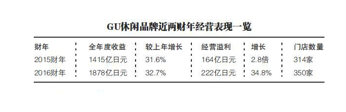 在优衣库业绩不佳的2016财年,GU的业绩表现却相当抢眼。据迅销集团2016财年年报显示,GU业绩在2016年度取得压倒性微弱表现,收益与溢利均大幅添加,全年度收益较上年度添加32.7%至1878亿日元,运营溢利增长34.8%至222亿日元。在女装针织衫、裤裙及宽脚裤等潮流商品微弱销售带动下,GU同店销售取得双位数增长。
