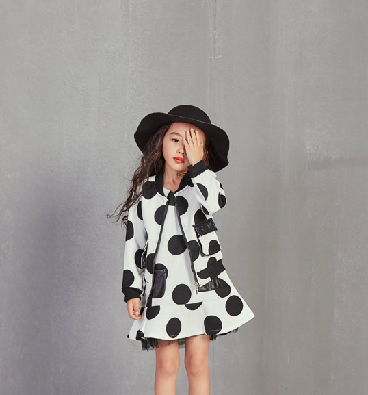 略带复古怀旧味道的大波点图案,仿佛有生命一般倾情弥漫到孩子的连衣裙上,其它独特的俏皮范儿,伴随着优雅浪漫的裙摆随风跳跃舞动,与小姑娘活泼可爱的个性十分契合,微微散开的裙摆也是一大吸睛亮点。