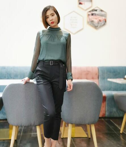 上衣的规划,利用网纱的袖子规划,给全体添加了模糊美,深绿色的全体色更加展现模糊的主题,上身效果修身,手臂处性感舒适而又不失潮流。