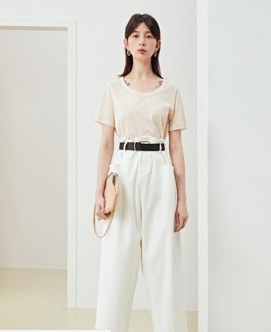 纯色不加多余修饰的短袖更容易穿出高级感,女生可以为自己选择一件杏色的短袖,颜色柔和清爽,版型简约自然,圆领的设计让造型更有亲和力。下身搭配一条白色休闲裤,颜色清扫干净,穿起来利落大方。再搭配一双白色气质凉鞋,打造出了简约时尚的休闲造型!