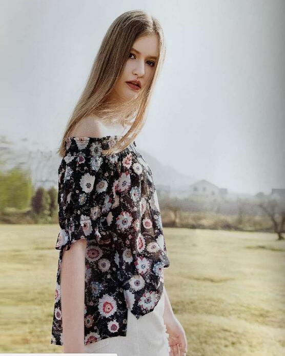 LOOK2:打造清新感的造型,不妨选择一款印花单品。一字肩印花短袖就不错,一字肩设计穿起来更显女人味,印花图案清新甜美。下身搭配一条白色的短裤,颜色清爽干净,穿起来拉长女生身型,呈现出高挑清新的造型!