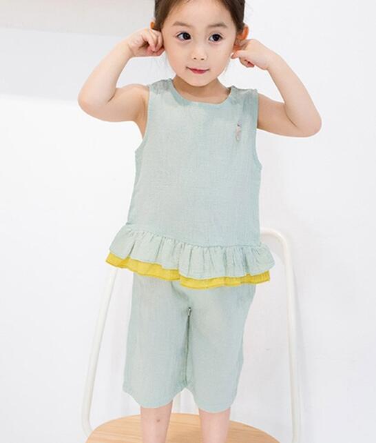 这款是一个套装的样式,采用薄荷绿的颜色,清透靓丽,上身是余个小背心的样式,胸口处又一个小小的卡通印花,下摆是黄色相间的小花边设计,与薄荷绿的花边组成叠层的花边,显得俏皮可爱。下身是一条小短裤,是一套甜美与时尚相结合的套装。