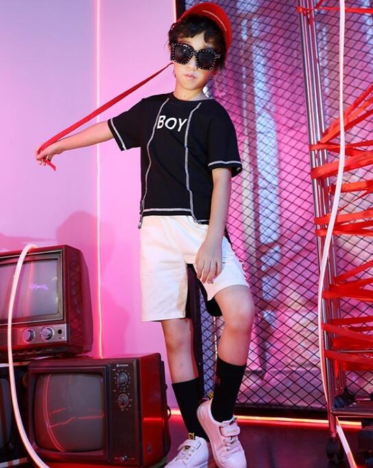 一件黑色T恤,印花字母BOY个性十足,衣服上添加的条纹元素也很港味。亮点在于下身短裤的拼接色,前面是白色后面是黑色,休闲感满满。搭配一双长袜和一双小白鞋,港味小潮男妥妥的。配饰能起很大的作用哦,一副墨镜一顶红色棒球帽都给整套搭配加了很多分。