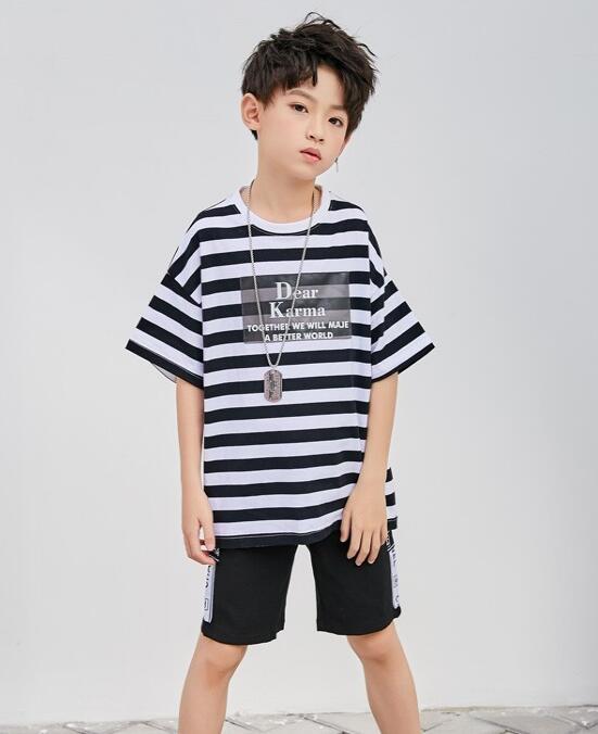 黑白条纹短袖更具时尚气息。简约圆领的设计,帅气有型。胸前字幕印花,格调有型有范儿。搭配一条黑色短裤,一双潮鞋整体看起来潮流帅气。