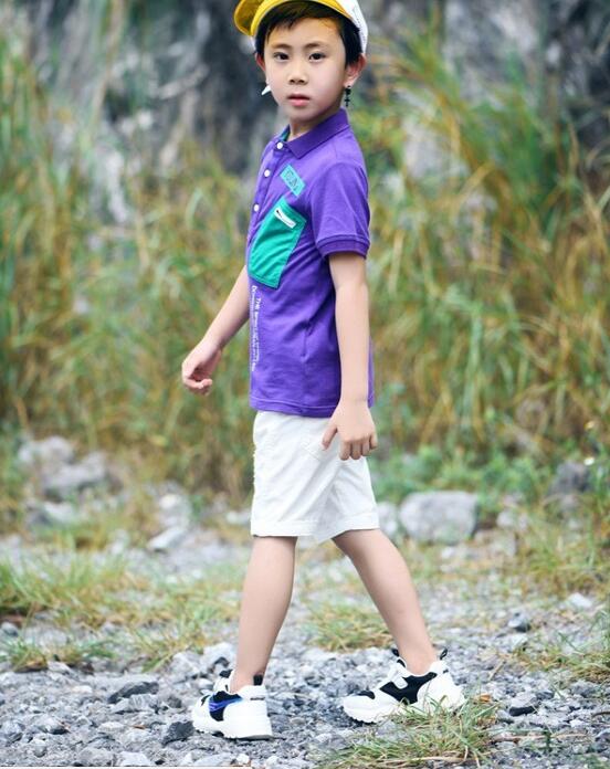 LOOK1:家长可以选择一件紫色的POLO衫,饱和度高,穿起来衬肤色,穿起来休闲时尚。下身搭配一条白色短裤,颜色清爽干净,简约有型。再搭配一双潮感运动鞋,打造出了时尚感的童装造型!