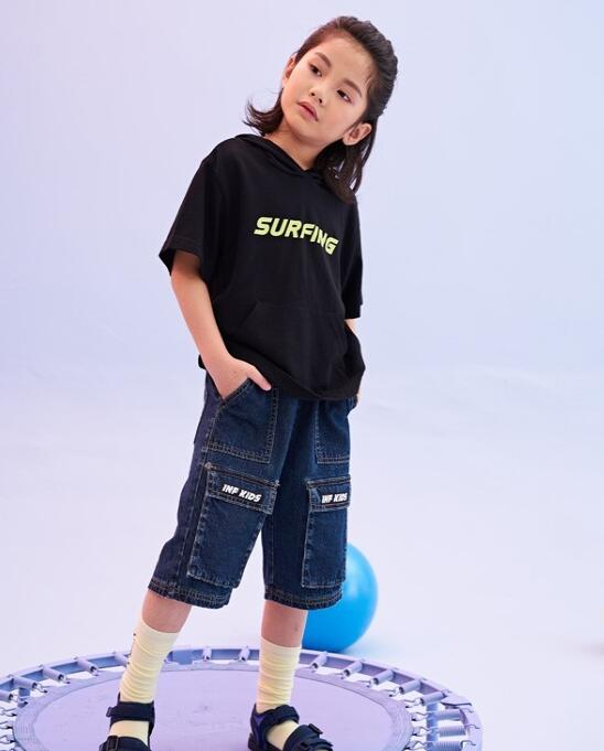 黑色短袖,宽松的版型适合各种身材的宝宝哦~帽子的加身,看起来休闲又时尚,字母的点缀给纯黑带来一抹色彩,下身搭配一条牛仔短裤,整体的搭配时尚又潮流,在夏日做最酷的宝宝,行走在时尚潮流的前端。