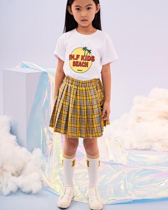 纯白色的短袖,卡通图案的设计给这件短袖带来时尚感,穿在身上显的俏皮可爱,下身搭配一条黄色格子百褶裙,即使是儿童也可以做最美的小仙子,在夏日尽显清凉。