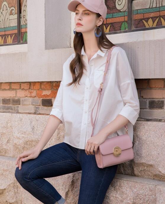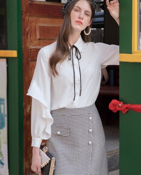 在日常上班中白衬衫是必不可少的,可以选择这款荷叶边比较小清新的这款衬衫,更显气质,搭配高腰A字版型的高腰半身裙会让整个人看起来高贵又大方,在日常生活或通勤上也可以选择这款穿搭。一双高跟鞋的搭配更是为整体的造型起到加分的作用,搭配一款手拿包就能轻松上班。整体的造型休闲又显气质。
