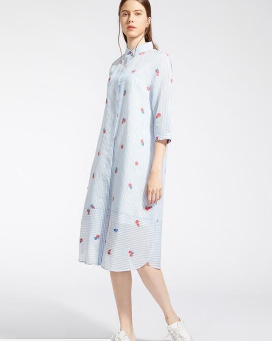 今年流行的衬衫版连衣裙也是非常适合各种身材的女孩哦,这件淡蓝色的连衣裙在夏天看上去非常显清凉,走起路来飘逸十足,裙身上的小碎花一朵朵印在裙身上,非常显气质,而且看上很小清新,清新中不失文艺,不会显的特别幼稚,搭配一双小白鞋,色调上非常和谐,整体的造型真的很文艺优雅,小仙女们快来选择这款连衣裙吧。