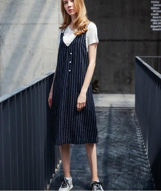 这套搭配是白色的短袖T恤,小v领的T恤和吊带裙的v领是很和谐的,纯棉的T恤给人一种舒适的穿搭体验,外面的竖条纹的吊带裙也是很好看的,经典的竖条纹有拉长身高的作用,在视觉上能显高。这套搭配看起来舒适又简单,还非常的时尚。