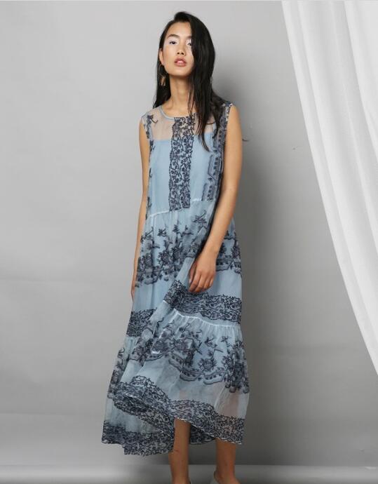 近些年来,很多设计师都比较钟爱偏中国风,这件裙子就是一件偏中国风设计的,里面是蓝色的吊带裙作为内衬,外面的轻纱上面是国画的印花,非常的有意境。微微有些鱼尾的的裙摆也很出色。简单的裙子设计,在印花上面却做了很有特点的设计,很有高级感。