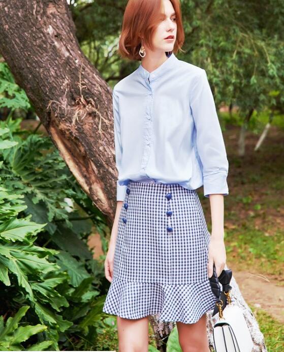 这套搭配第一眼看上去就非常的清新自然,淡蓝色的衬衣,纯镜面的设计,经典的衬衣设计,完全没有一丝多余的修饰,完美的线条感让这件衬衣看起来很有质感。搭配的半身裙也是同样的色系,蓝色的格子半身裙也是非常好看的,因为上衣的简约,下面搭配的裙子设计就相对会有些复杂,纽扣的设计和花边的裙摆都很完美。