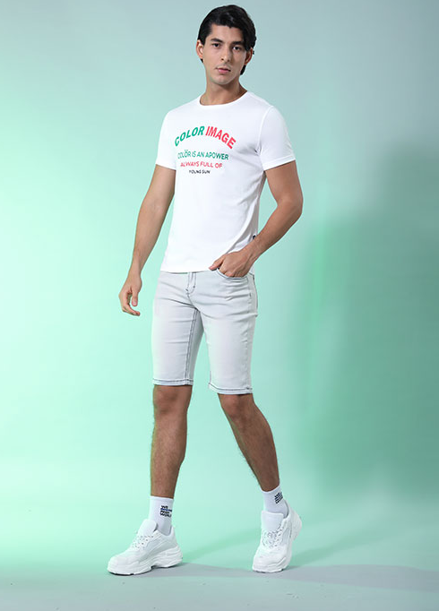 下身随意穿搭一条白色五分牛仔裤,轻松塑造时尚休闲达人感,不论是生活中亦或者是游玩,轻松穿搭,轻松塑型,非常的舒适,随意穿搭都能体现男性魅力感。