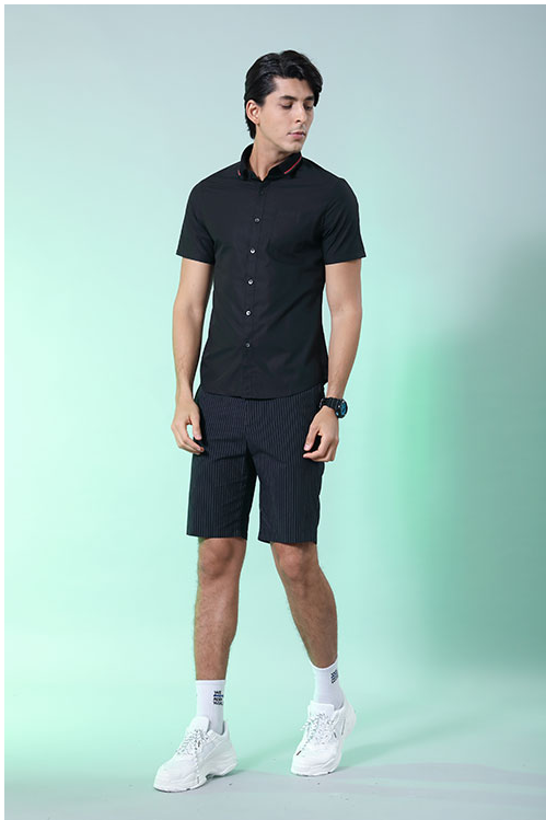 不得不说黑白是经典中的经典,很多原始元素都是从黑白开始,当然不能少的了黑色系列的衬衣啦,莎斯莱思这款短袖黑色衬衣从面料到设计都无不彰显着细节制作。