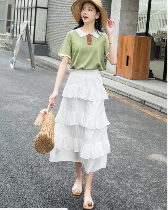 Polo领的衣服可以有很多的款式设计,也有很多种不同风格的搭配,随着搭配单品的变化,风格也会转变。这套搭配是一件浅绿色的Polo衫搭配一件甜美的半身裙,全身都透露出一种甜美的浪漫气质,牛油果色是今年一直流行的颜色,清新的牛油果绿是不仅看起来非常的清爽,还与自然结合,非常适合在炎热的夏季穿。下面搭配的是一条白色的蛋糕裙,纯洁的白色和浪漫的蛋糕裙的款式结合,简直可以说是非常完美了,在行走间一定能吸引所有人的目光。