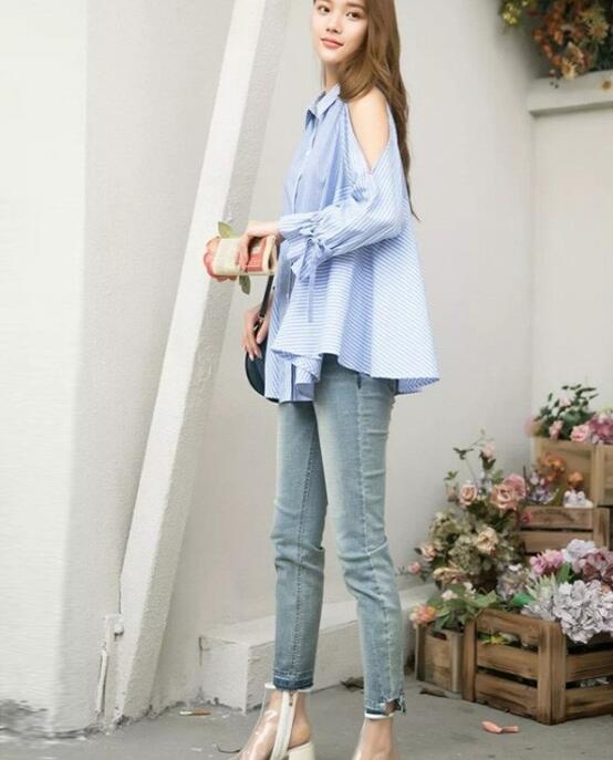 条纹永远是时尚界的宠儿,经久不衰的流行元素。条纹衬衣,露肩的设计,看起来性感又凉爽。宽松的版型适合各种身材的妹子,衣摆处的褶皱看起来充满少女心不失甜美感。小翻领的设计,更显气质。下身搭配一条牛仔裤,看起来帅气又很个性,搭配一双高跟鞋,轻松打造大长腿,让你的身材曲线完美的展现出来。