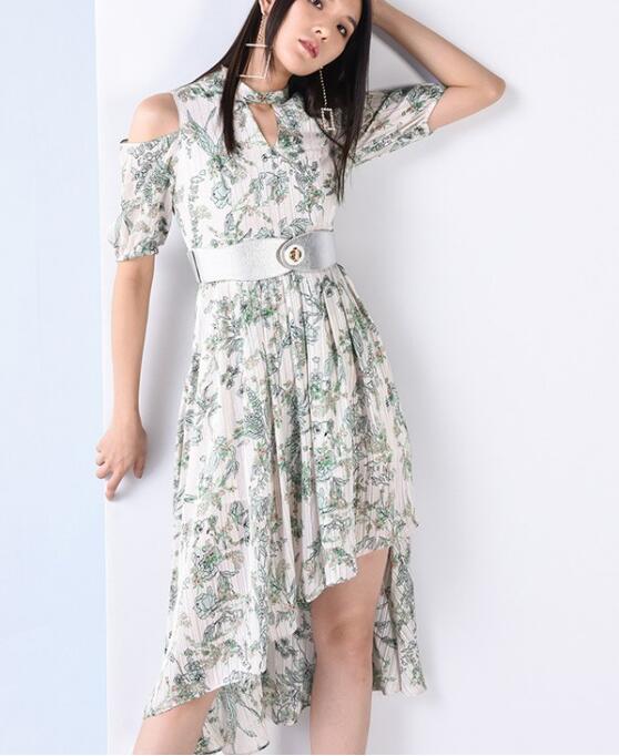 对于一些女性来讲,裙子才是他们的首选,这款碎花连衣裙穿在身上优雅大方,领口的设计,独特吸睛,打破陈规让你爹美丽尽情绽放。腰间腰带的搭配,轻松束出曼妙腰身,修身版型更好的展现完美的身材曲线,不规则的裙摆,显露出性感的腿部,露肩的设计,也很性感优雅,整体的造型,真的很有女神范。