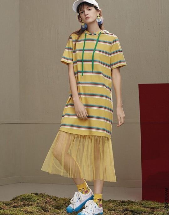 这款T恤连衣裙真的很时髦,条纹的设计,永远不会过时,外出逛街时,这样一款短袖连衣裙就可以解决掉不必费心神,裙摆的设计,独特还有一种朦胧的美感,搭配一双潮鞋,这样独特的穿搭走在街上回头率百分百,而且黄色颜色也很现货破,穿上它真的很显气色而且很显精神, 看起来元气满满。