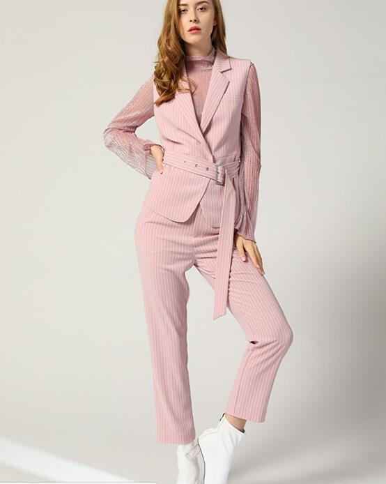 这款粉色的小西装,翻领+V领的设计简约时尚,也很时髦,内搭一件粉色上衣,腰间腰带的搭配将腰身轻松束出来,下身搭配一件粉红色的西装裤,整套的搭配,甜而不腻,修身的版型穿在身上并不会觉有臃肿感,搭配一双白色高跟鞋,整体的气质将女性的浪漫与味美展现出来,优雅大气体现的淋漓尽致。