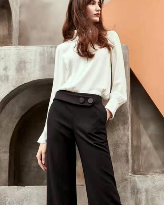 长袖上衣在秋日也是经常会运用到的,莆田安福家园女装品牌的这款白色长袖上衣,颜色清爽百搭,设计简约自然,穿起来不失气质,内搭和外穿都可以。下身搭配一条黑色的高腰长裤,颜色经典百搭,穿起来耐看不失时尚感,高腰设计显腿长!