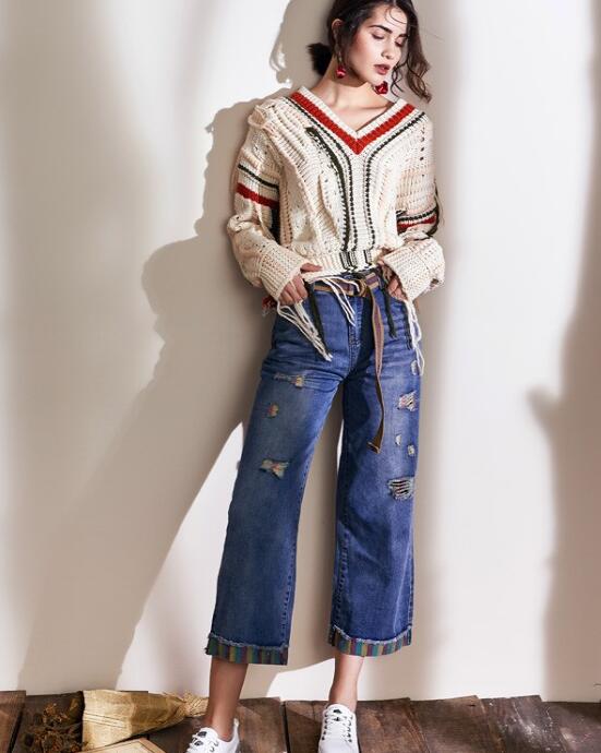 这套搭配更有时尚感,一件设计感很强的毛衣让人爱不释手,而且还是v字领,可以很好的修饰脸型,花色也很有设计特色。下面搭配的是一条蓝色的牛仔阔腿裤,这身搭配休闲又时尚,真的非常耐看,不管是日常穿,还是通勤穿,都是非常合适的。