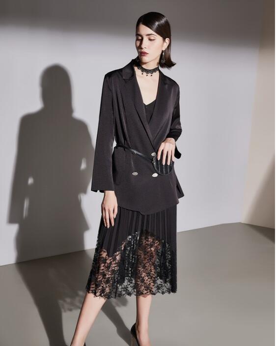 西装是很多女生都喜欢的秋季时尚单品,这套搭配是一个黑色的西装和黑色的纱裙的搭配,真的非常的精致耐看,而且还很高级。这件西装还是丝绒的材质,穿起来非常的有质感,下面的裙子是蕾丝的设计,浪漫又优雅。