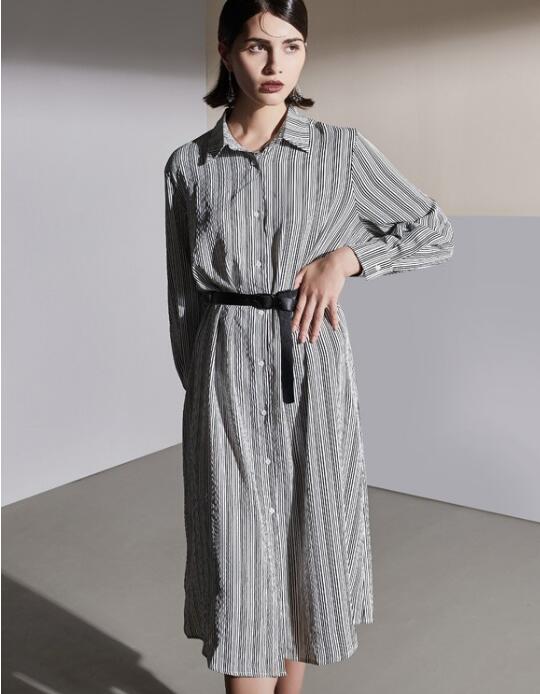 这件连衣裙一定能满足你对气质感的幻想,黑白的竖条纹也是很经典的时尚元素,而且竖条纹可以从视觉上拉长身高,这件连衣裙在领口处的设计是衬衣式的,非常的经典耐看。腰部还有一个系带的设计,很有设计特色。