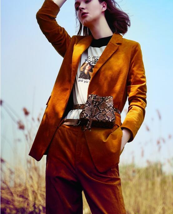 焦糖色套装搭配白色T恤非常显年轻,衣服穿对了,可以立刻有显年轻的作用,有的姑娘们认为焦糖色更适合30+的姑娘,其实不是这样得啦。优雅沉静的它也可以穿出浓浓的文艺复古范儿,搭配上腰间的个性蛇皮纹水桶腰包,整体look更有秋冬浓郁的感觉,也更偏成熟。