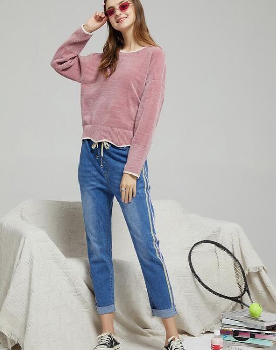 而这款毛衣则很显年轻,圆领的设计经典大方,粉色演颜色甜而不腻,反而有一种温婉的气质流露出来,版型也是很舒适的一种,下身搭配一件蓝色牛仔裤,这样的裤装穿搭真的很显年轻,将自己的青春活跃展现出来,搭配一双帆布鞋,妥妥的一枚大学生范,这样的休闲搭配你还在等什么不管你多大穿上都是衣蛾小可爱。